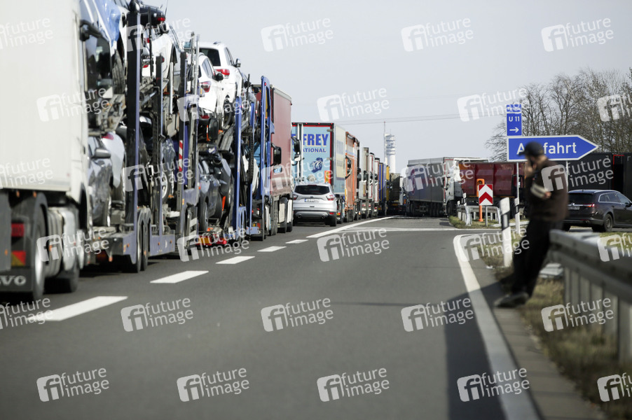 LKWs stehen auf der A12 in Fahrtrichtung Polen im Stau. Die Grenzen zwischen Polen und Deutschland sind wegen des Coronavirus geschlossen. Frankfurt (Oder), 16.03.2020