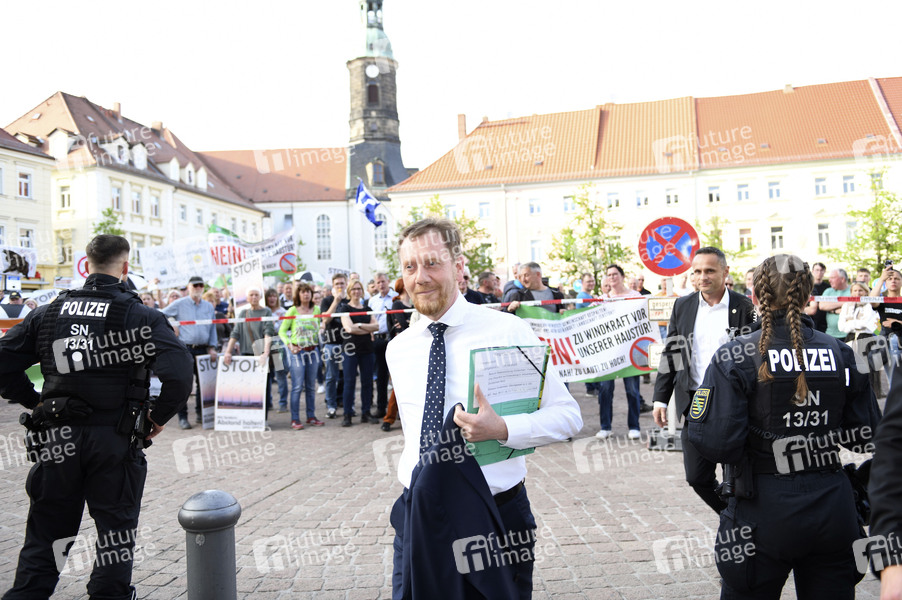 Demonstration gegen zukünftigen Windanlagen in der Region Großenhain vor dem Rathaus. Michael Kretschmer nimmt seinem Weg durch die Protestierenden zu einem Gespräch zur Entwicklung des Industriegebietes Großenhain Nord mit dem Oberbürgermeister Sven Mißbach und den Großenhainer Stadtrat. Großenhain, 16.04.2025