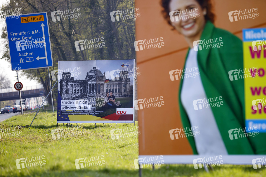 Wahlplakate der CDU / evp und der FDP mit ihrer Kandidatin Nicola Beer zur Europawahl auf einer Wiese in Klettenberg. Köln, 15.04.2019