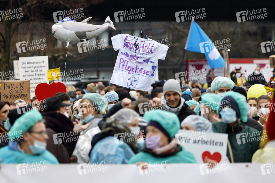 Bei einer angemeldeten Demo demonstrierten etwa 8000 Gegner einer Impfpflicht mit einem Spaziergang gegen die Corona-Maßnahmen der Bundesregierung - darunter auch viele Pflegekräfte, die wegen der Impfpflicht im Gesundheitsbereich ihren Job zu verlieren drohen. Düsseldorf, 15.01.2022
