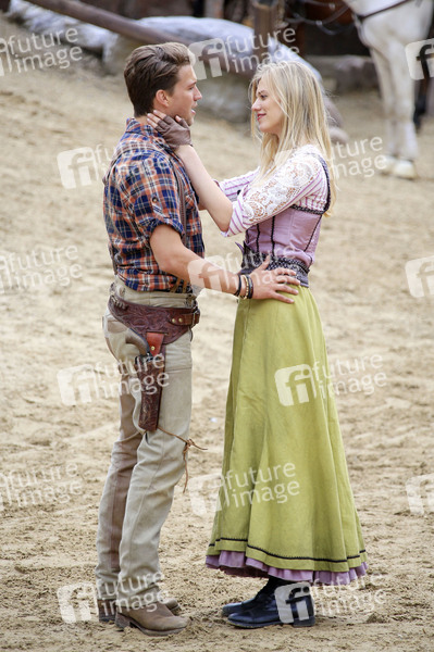 Raul Richter und Larissa Marolt beim Pressetermin der Karl-May-Spiele 2019 mit Szenen aus 'Unter Geiern - Der Sohn des Bärenjägers' im Freilichttheater am Kalkberg. Bad Segeberg, 21.06.2019