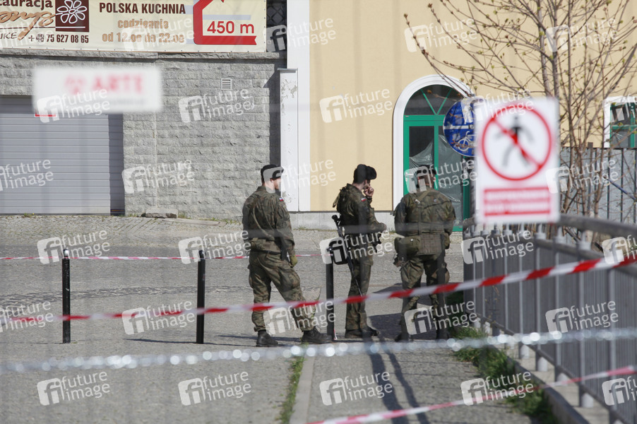 Der wegen der Coronakrise gesperrte Grenzübergang Altstadtbrücke von Görlitz nach Zgorzelec wird vom polnischen Militär bewacht. Görlitz, 11.04.2020