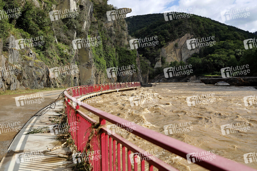 In der Eifel haben heftige Regenfälle und Dauerregen für Überschwemmungen und Überflutungen gesorgt. Im Ahrtal trat der Fluss vielerorts über die Ufer und überschwemmte nicht nur Keller sondern ganze Ortschaften. Im Bild die Straße zwischen Dernau und Walporzheim, die von den Fluten auf einem Abschnitt einfach mitgerissen wurde. Dernau, 15.07.2021