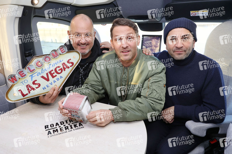 Frank Rosin, Alexander Kumptner und Ali Güngörmüs beim Pressetermin zur Kabel 1 Kochserie 'Roadtrip Amerika' in der Hafen City, Hamburg, 12.12.2022