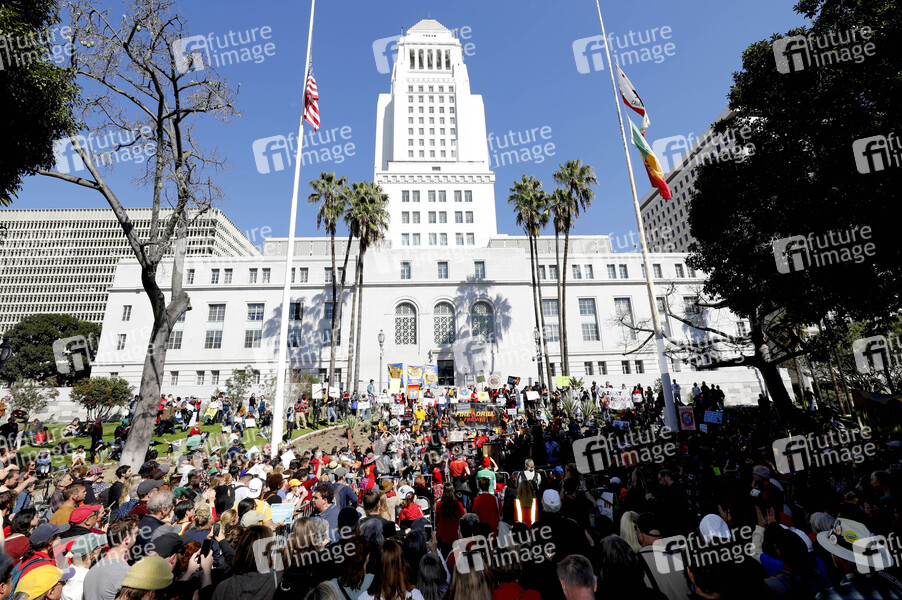 Demonstranten bei der Fire Drill Fridays Kundgebung gegen den Klimanotfall vor dem Rathaus. Los Angeles, 07.02.2020