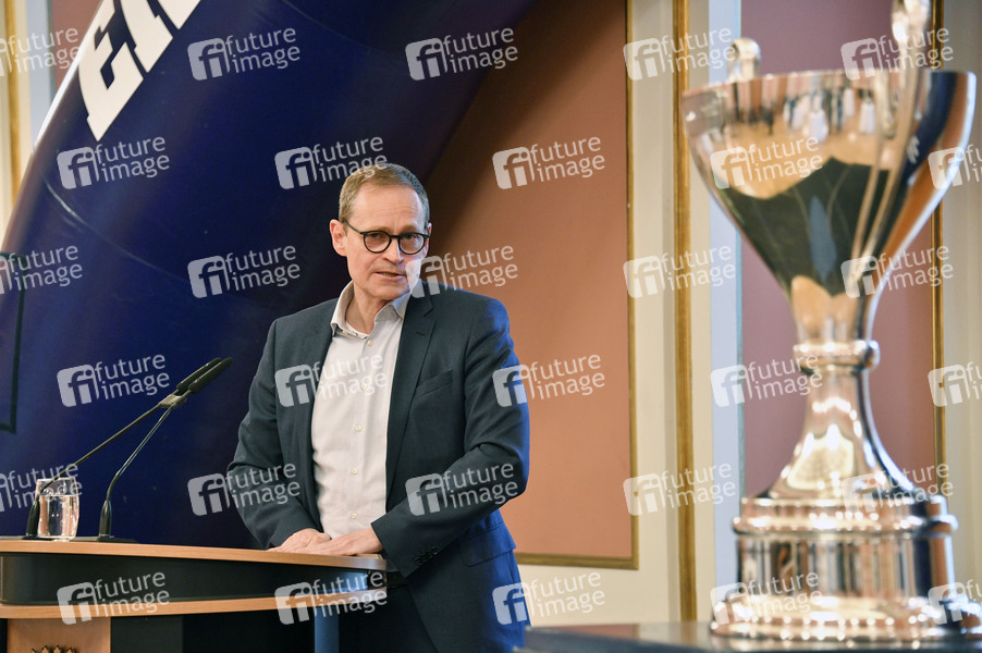 Michael Müller bei Rede und Einzeichnungen der einzelnen Spieler, Trainer und Begleiter der Eisbären Berlin ins Gästebuch von Berlin aus Anlass des 8. Deutschen-Meister-Titels im Roten Rathaus. Berlin, 28.05.2021