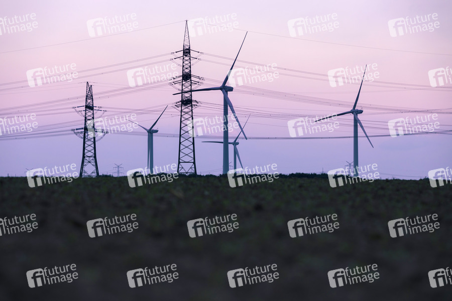 Stromleitungen und Windkraftanlagen nahe des Kraftwerk Niederaußem von RWE im Kölner Umland. Bergheim, 17.07.2020