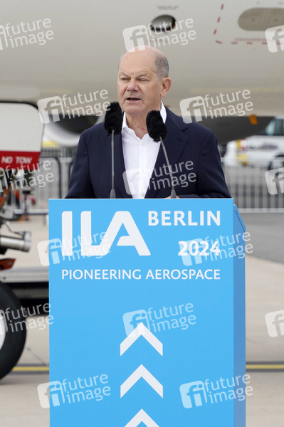 Olaf Scholz vor einem Airbus A321 beim Eröffnungsrundgang der ILA Berlin auf dem ILA-Gelände am Flughafen BER Berlin-Brandenburg. Berlin, 05.06.2024