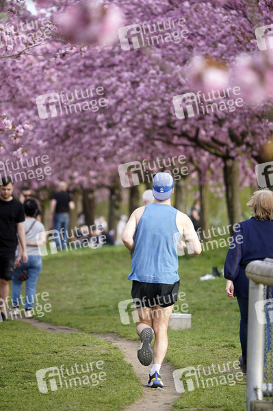 Blühende Japanische Kirschbäume entlang der TV-Asahi-Kirschblütenallee am Berliner Mauerweg im Stadtteil Lichterfelde und Teltow. Berlin, 07.04.2024