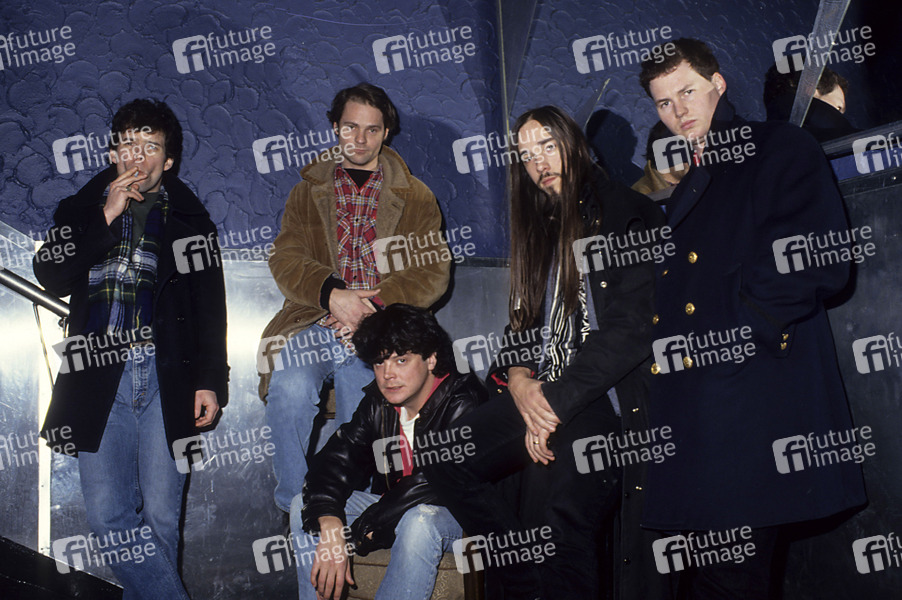 Gord Sinclair, Gord Downie, Paul Langlois, Rob Baker und Johnny Fay von The Tragically Hip bei einem Photoshooting im Kaiserkeller. Hamburg, 10.08.1990