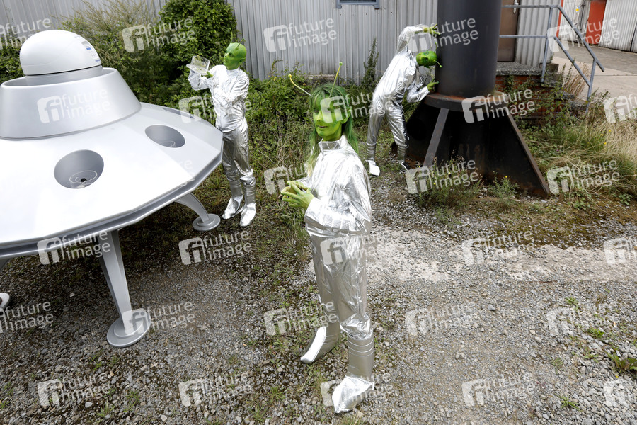 GEEK ART - Bodypainting meets SciFi, Fantasy and more: UFO Photoshooting mit Paul Skupin, Enrico Lein und Maria Skupin als Außerirdische nach einer Landung auf einem Industriegelände auf dem Planeten Erde. Bakede, 24.08.2019 - Ein Projekt des Fotografen Tschiponnique Skupin und des Bodypainters und Transformakers Enrico Lein