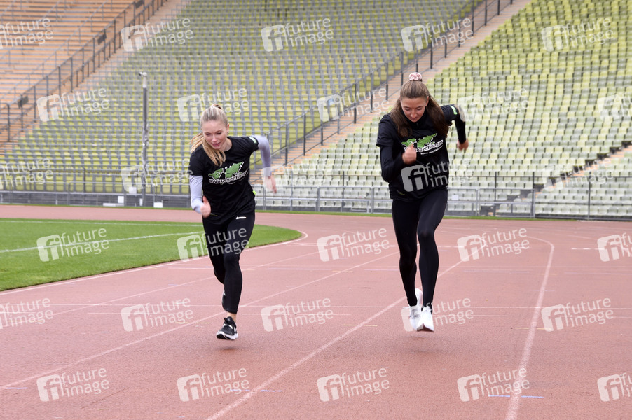 Katharina Trost und Christina Hering beim Fototermin zur sportichen '#WocheChallenge' im Olympiastation München. Unter dem Motto 'Wir können was bewegen!' ruft die Welthungerhilfe zu dieser Challenge auf und bittet um Spenden für eine Welt ohne Hunger. München, 13.10.2020
