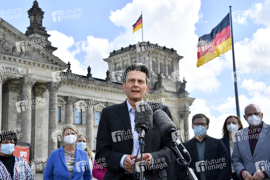Rolf Mützenich und Fraktionsmitglieder bei einer Aktion über die Bilanz der Arbeit der SPD-Bundestagsfraktion vor dem Reichstagsgebäude. Berlin, 20.05.2021