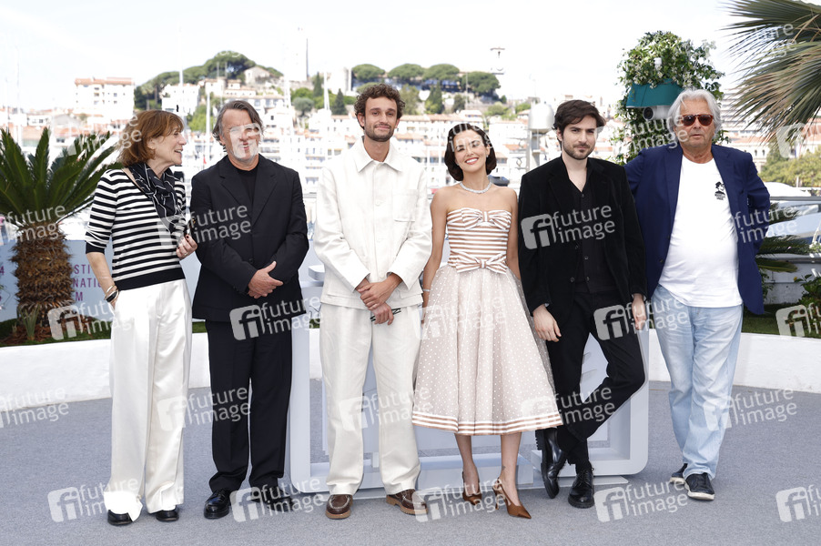 Michele Halberstadt, Richard Linklater, Aubry Dullin, Zoey Deutch, Guillaume Marbeck und Laurent Petin beim Photocall zum Kinofilm 'Nouvelle Vague / New Wave' auf dem Festival de Cannes 2025 / 78. Internationale Filmfestspiele von Cannes am Palais des Festivals. Cannes, 18.05.2025