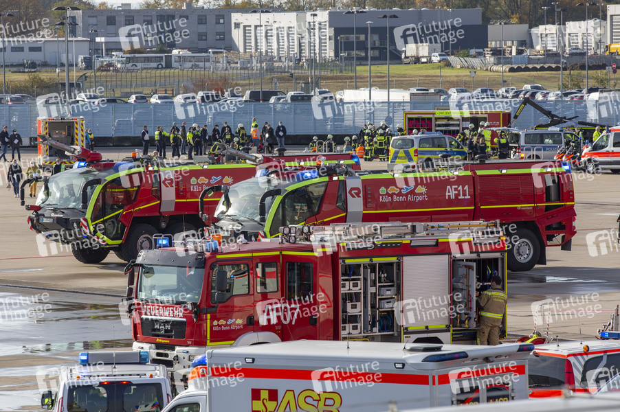 Einsatzfahrzeuge und Einsatzkräfte bei der Notfallübung der Werkfeuerwehr, der Feuerwehr Köln und den Hilfsorganisationen am Flughafen Köln/Bonn. Im Rahmen der Übung wird die Kollision eines Flugzeugs mit einem Passagierbus und einer Abfertigungshalle simuliert. Einsatzkräfte retten aus dem in Brand geratenen Flugzeug und dem Gebäude Personen und versorgten diese. Köln, 06.11.2021