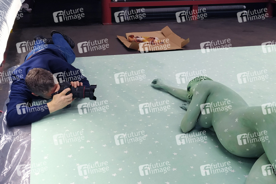 Bodyart-Künstler Jörg Düsterwald realisiert zum Thema 'Vielfältigkeit' mit verschiedenen Fotomodell-Typen eine Kunstwerk-Serie. In den Produktionshallen des kooperierenden Unternehmens Vorwerk flooring in Hameln hat er das schwangere Model Anastasia passend zum gesponserten Bodenbelag mit einem Bodypainting versehen und anschließend flüssige Farbspuren aufgetragen. Im Bild Projektfotograf Tschiponnique Skupin.