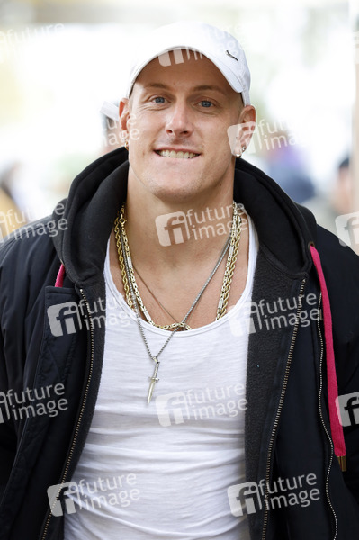 Calvin Kleinen bei der Eröffnung von 'Willi Herren's Rievkooche Bud'. Willi Herren stellt seinen Reibekuchen-Truck am Gelände der Selgros vor. Köln, 16.04.2021