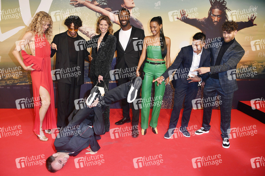 Jenny Freitag-Praxmarer, Sebastian Killa Sebi Jaeger, Majid Kessab, Svenja Jung, Ben Wichert, Luwam Luulu Russom, Willy Hem und Christian Robozee Zacharas bei der Premiere des Kinofilms 'Fly' im Zoo Palast. Berlin, 07.10.2021