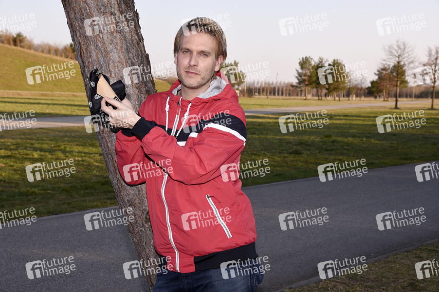 Robin Bade mit selbstgebastelten Mundschutz bei einem exklusiven Photoshooting im Riemer Park. München, 02.04.2020