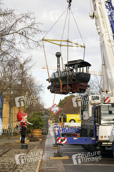 Ein weiteres Filmrequisit für die 'Giant Props' Sammlung ungewöhnlicher Originale, die Lokomotive Emma aus den Jim Knopf Filmen, wird auf der Straße der Giganten im Filmpark Babelsberg aufgestellt. Filmparkchef und 'Lokomotivführer' Friedhelm Schatz organisiert den Transport. Potsdam, 16.11.2020