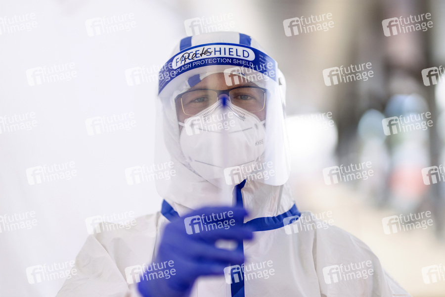 Wegen der Corona-Krise bzw. Corona-Pandemie werden im Corona-Testzentrum am Köln Bonn Airport Reiserückkehrer aus Risikogebieten auf Corona getestet. Köln, 11.08.2020