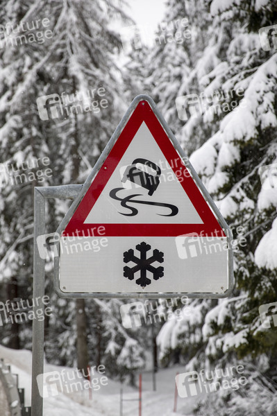 'Verkehrszeichen Schleudergefahr bei Straßenglätte' im Winter. Davos, 22.12.2019