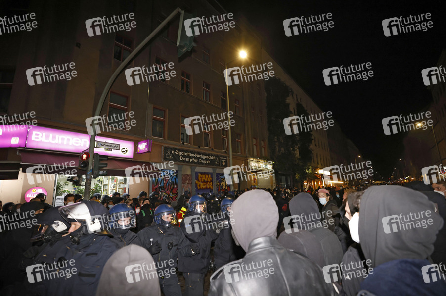 Bei einer Demo gegen die Räumung des linksautonomen Bauwagen-Camps 'Köpi' in Berlin-Kreuzberg ist es zu Ausschreitungen gekommen. Dabei wurden Polizisten mit Flaschen, Steinen und Feuerwerkskörpern beworfen. Unbekannte haben in der Reichenbergerstraße Scheiben mehrerer Autos zerschlagen, Verkehrsschilder in parkende Autos gerammt und Dixieklos umgeschubst. Laut Polizei waren 7.000 bis 8.000 Teilnehmer vor Ort. Berlin, 15.10.2021