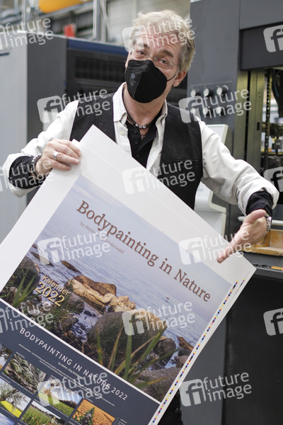 Jörg Düsterwald bei der Präsentation des Düsterwald-Kalenders 'Bodypainting in Nature 2022' in der Druckerei QUBUS media. Hannover, 30.07.2021