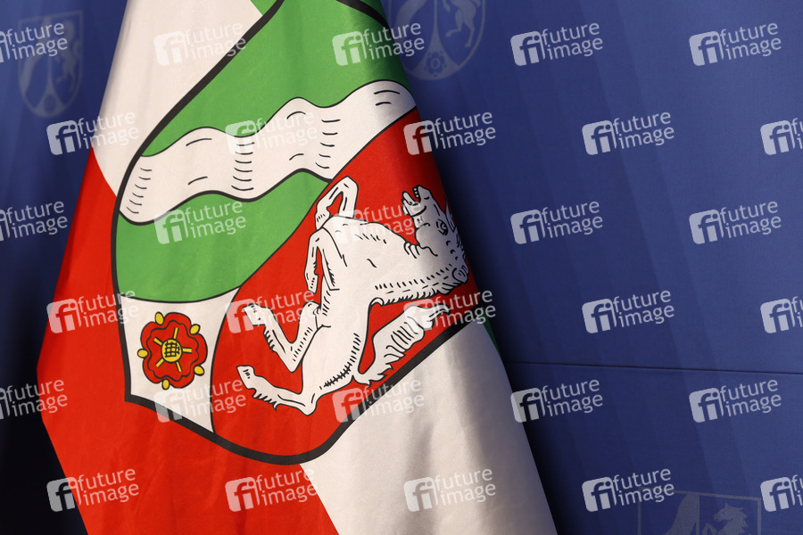NRW-Ministerpräsident Hendrik Wüst empfängt Sternsingerinnen und Sternsinger zum traditionellen Dreikönigssingen aus den umliegenden Bistümern und nimmt ihren Segen entgegen in der Staatskanzlei Düsseldorf. Im Bild die Landesflagge mit den Landesfarben und dem Landeswappen des deutschen Bundeslandes Nordrhein-Westfalen. Düsseldorf, 01.06.2022
