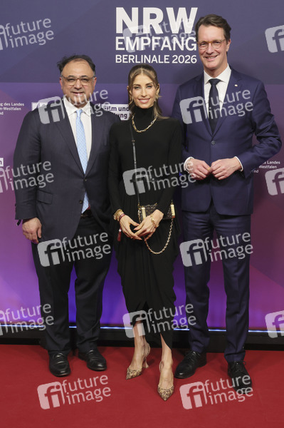 Walid Nakschbandi, Cathy Hummels und Hendrik Wüst beim 23. NRW Empfang des Landes NRW und der Film- und Medienstiftung NRW im Rahmen der Berlinale 2026 in der Vertretung des Landes Nordrhein-Westfalen. Berlin, 15.02.2026