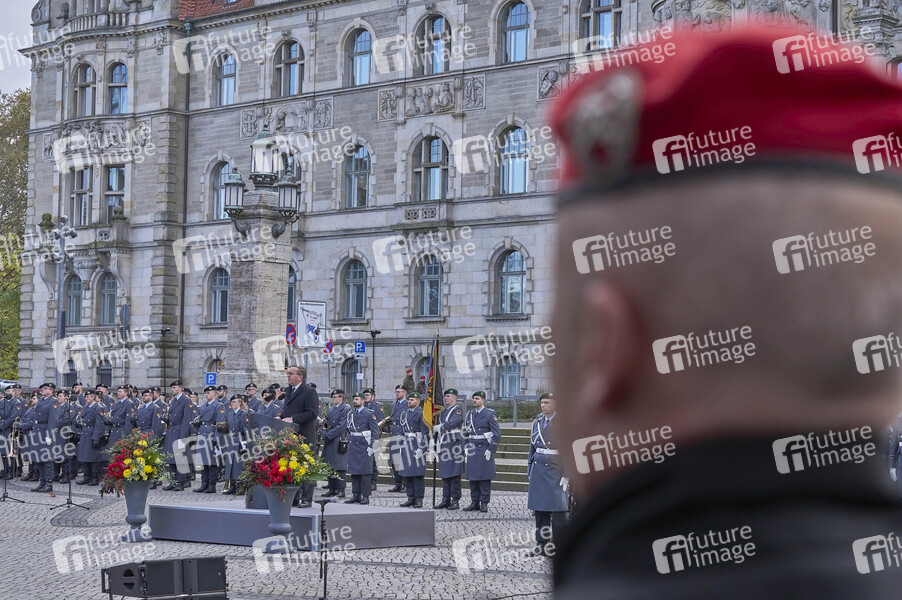 Boris Pistorius beim Feierlichen Gelöbnis zum Gründungstag der Bundeswehr auf dem Platz der Menschenrechte vor dem Neuen Rathaus. Hannover, 12.11.2024