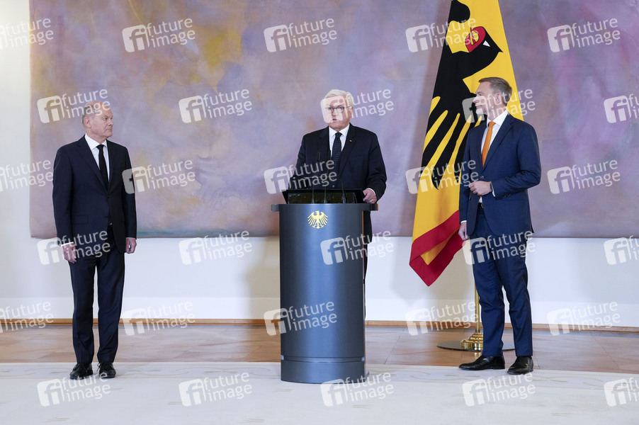 Olaf Scholz, Frank-Walter Steinmeier und Christian Lindner bei der Übergabe der Entlassungsurkunden gemäß Artikel 64 Abs. 1 Satz 1 des Grundgesetzes auf Vorschlag des Bundeskanzlers an den Bundesminister der Finanzen Christian Lindner, dem Bundesminister der Justiz Marco Buschmann und der Bundesministerin für Bildung und Forschung Bettina Stark-Watzinger sowie der Ernennungsurkunden für den neuen Justizminister Volker Wissing und den neuen Finanzminister Jörg Kukies im Schloss Bellevue. Berlin, 07.11.2024