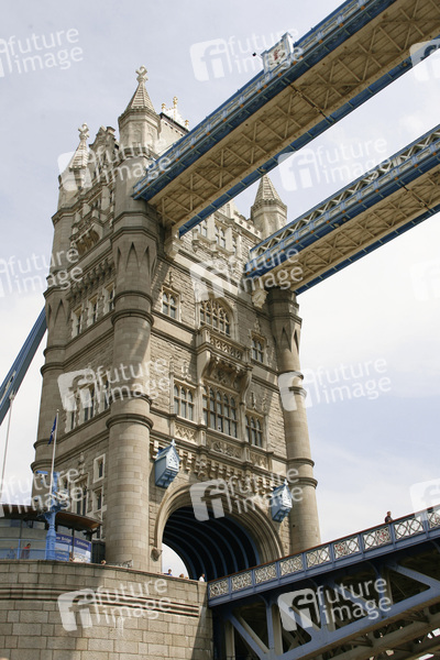 Klappbrücke, Neugotik, 244 Meter lang, Höhe der Brückentürme 65 Meter, die Fahrbahn zwischen den 61 Meter voneinander entfernten Türmen liegt neun Meter über dem Fluss, Fußgängerbrücke in 43 Meter Höhe, die beiden Baskülen können bis zu einem Winkel von 83 Grad hochgeklappt werden, Architekt Horace Jones, erbaut 1886 bis 1894, Themse