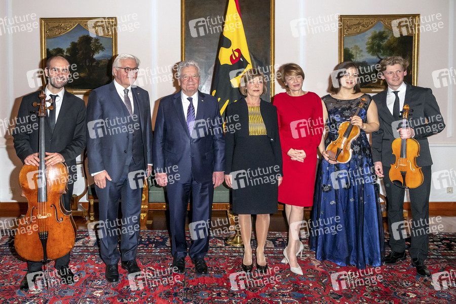 Frank-Walter Steinmeier, Joachim Gauck, Daniela Schadt und Elke Büdenbender mit Musikerin beim Abendessen zu Ehren von Joachim Gauck anlässlich seines 80. Geburtstags im Schloss Bellevue. Berlin, 11.02.2020