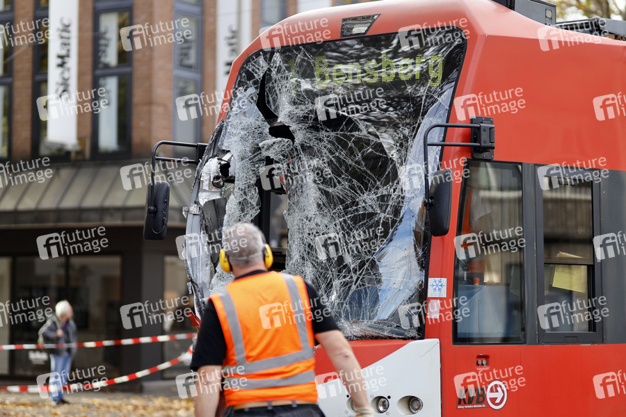 Bei einem schweren Straßenbahn-Unfall am Neumarkt zwischen zwei KVB-Zügen der Linien 1 und 7 sind 20 Menschen verletzt worden, eine Bahnfahrerin schwebt in Lebensgefahr. Als Ursache gilt derzeit eine fehlerhafte Weichenstellung. Köln, 02.11.2020