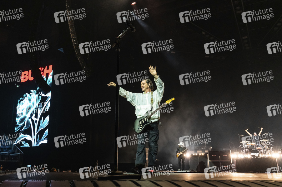Gavin Rossdale, Corey Britz und Nik Hughes von Bush live bei einem Konzert in der ZAG Arena. Hannover, 21.10.2025