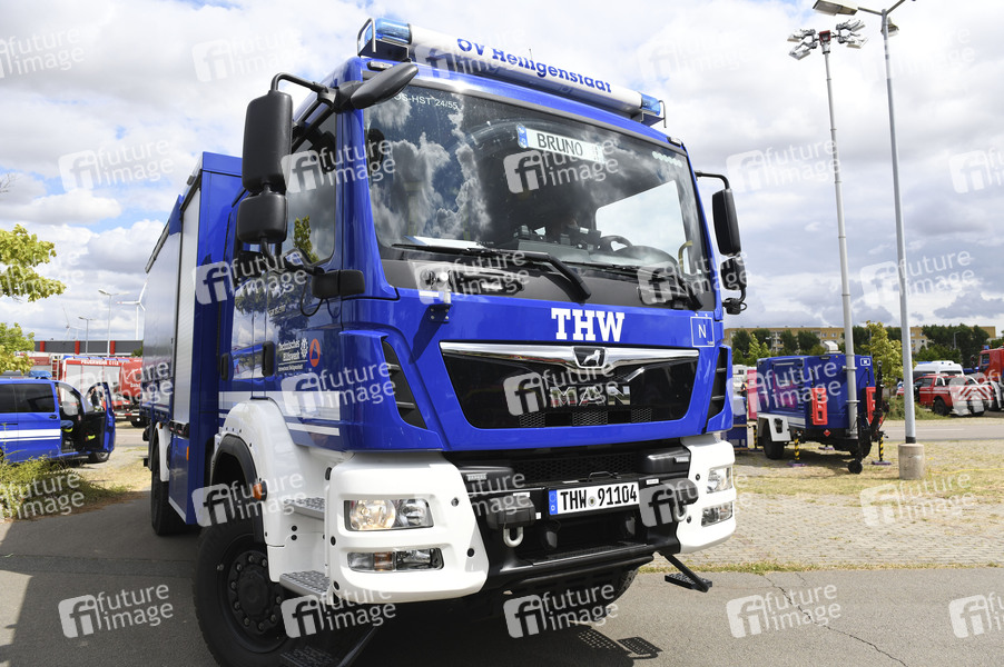 THW Einsatzfahrzeug beim Pressetermin in der Gohrischheide, wo es seit dem 1. Juli brennt. Derzeit wird von einer vom Brand betroffenen Fläche von etwa 2.100 Hektar ausgegangen. Aktuell befinden sich etwa 600 Kräfte von der Freiwilligen Feuerwehr, dem Technischen Hilfswerk, der Bundeswehr, der Polizei und anderen Organisationen in den fünf Einsatzabschnitten im Einsatz. Im Einsatzabschnitt Jacobsthal ist die Lage stabil. Es gilt weiterhin eine Ausbreitung des Brandgeschehens Richtung Süden zu verhindern sowie den alten Sprengplatz und die Ortschaft zu schützen. Jacobsthal, 07.07.2025