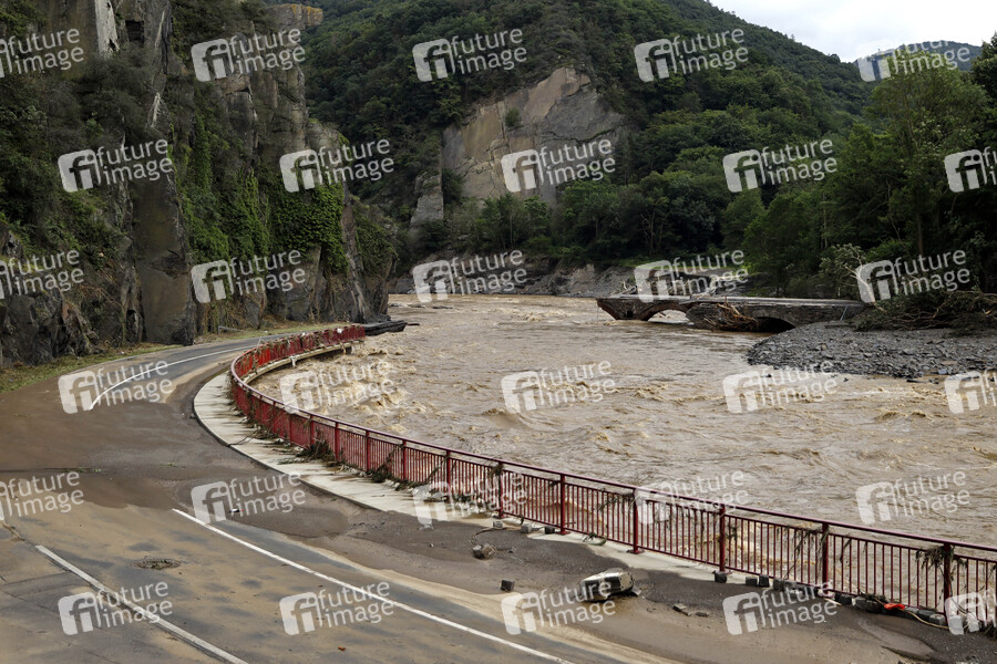 In der Eifel haben heftige Regenfälle und Dauerregen für Überschwemmungen und Überflutungen gesorgt. Im Ahrtal trat der Fluss vielerorts über die Ufer und überschwemmte nicht nur Keller sondern ganze Ortschaften. Im Bild die Straße zwischen Dernau und Walporzheim, die von den Fluten auf einem Abschnitt einfach mitgerissen wurde. Dernau, 15.07.2021