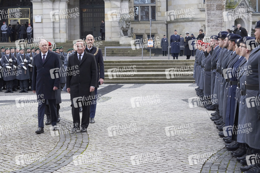 Stephan Weil, Boris Pistorius und Belit Onay beim Feierlichen Gelöbnis zum Gründungstag der Bundeswehr auf dem Platz der Menschenrechte vor dem Neuen Rathaus. Hannover, 12.11.2024