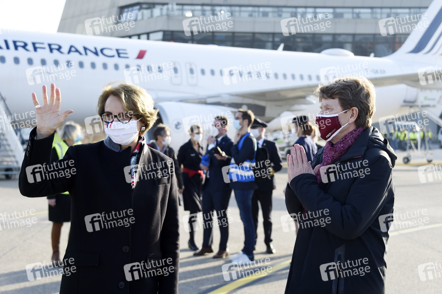 Botschafterin Anne-Marie Descotes und Flughafenchef Engelbert Lütke Daldrup beim letzten Abflug. Mit der Inbetriebnahme des Flughafens Berlin Brandenburg Willy Brandt (BER) wird der gesamte Luftverkehr der Hauptstadtregion an einem Standort konzentriert. Der Flughafen Tegel, kurz TXL, schließt am 8. November. 60 Jahre nach dem ersten Linienflug von Air France wird am 8. November ein Flugzeug der französischen Airline zum allerletzten Mal von dem Flughafen im Nordosten Berlins starten und Adieu sagen. Berlin, 08.11.2020