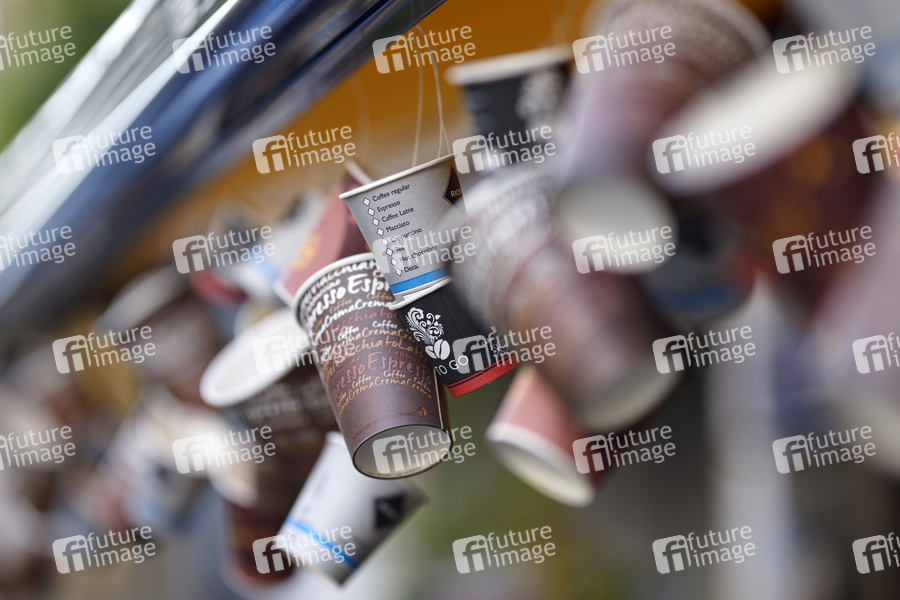 Kaffee, Coffee, Cafe, Kaffeebecher, Kaffee to go, Coffee to go, Cafe to go, Trinkbecher, Cup, Plastikmüll, Papiermüll, Müll, Wegwerfen, Müll, Müllverwertung, Basteln, Müllproduktion, Take-Away, Müllberge, Girlande, Coronakrise, Corona, Corona-Krise, Kiosk, Kioskkultur, zum Mitnehmen, Einweg, Einweggeschirr, Einwegbecher, Einweg, Abfall, Abfälle, Abfallentsorgung, Entsorgung, Abwallwirtschaft, Becherpfand, Becher, Behälter, Tasse, Coffe-to-go, Kaffee-to-go, entsorgen, Entsorgung, Pappbecher, Pappe, Umweltbewusstsein, Umweltbelastung, Verpackungen, Verpackungsmüll, Verpackungsmaterial, Wegwerfgesellschaft, wegwerfen, Wegwerfbecher, Symbolbild, Symbolfoto