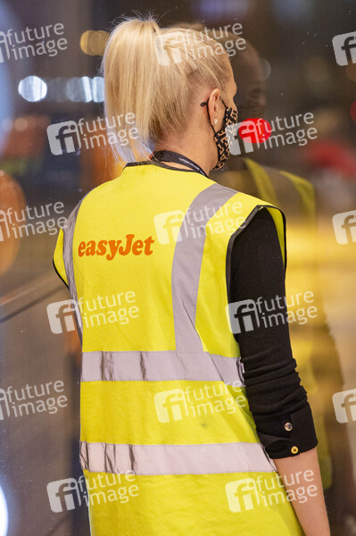 Allererster kommerzieller Abflug vom BER mit easyJet nach London Gatwick am Gate im Non-Schengen-Bereich des Terminal 1 im Flughafen Berlin Brandenburg. Schönefeld, 01.11.2020