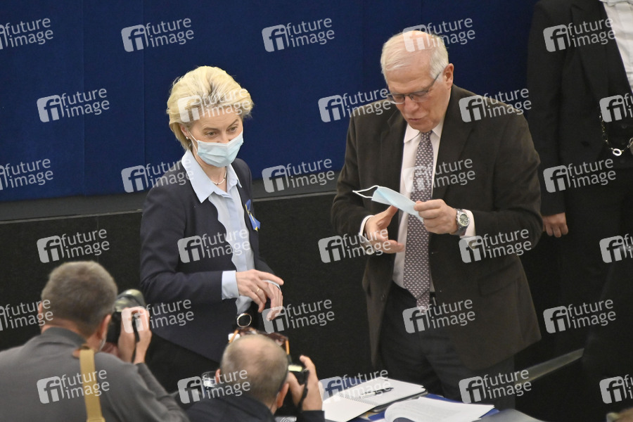Ursula von der Leyen und Josep Borrell bei einer Plenartagung zu den jüngsten Entwicklungen des Krieges gegen die Ukraine und der EU-Sanktionen gegen Russland und deren Umsetzung im Plenarsaal des Europäischen Parlaments. Straßburg, 06.04.2022