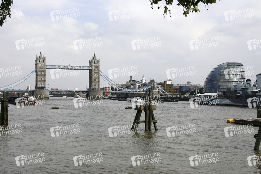 Klappbrücke, Neugotik, 244 Meter lang, Höhe der Brückentürme 65 Meter, die Fahrbahn zwischen den 61 Meter voneinander entfernten Türmen liegt neun Meter über dem Fluss, Fußgängerbrücke in 43 Meter Höhe, die beiden Baskülen können bis zu einem Winkel von 83 Grad hochgeklappt werden, Architekt Horace Jones, erbaut 1886 bis 1894, Themse, City Hall