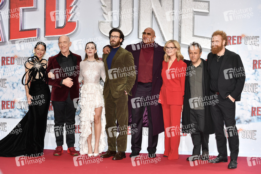 Lucy Liu, J.K. Simmons, Kiernan Shipka, Chris Evans, Dwayne Johnson, Bonnie Hunt, Jake Kasdan und Kristofer Hivju bei der Weltpremiere des Kinofilms 'Red One - Alarmstufe Weihnachten' im UCI Luxe East Side Gallery. Berlin, 03.11.2024