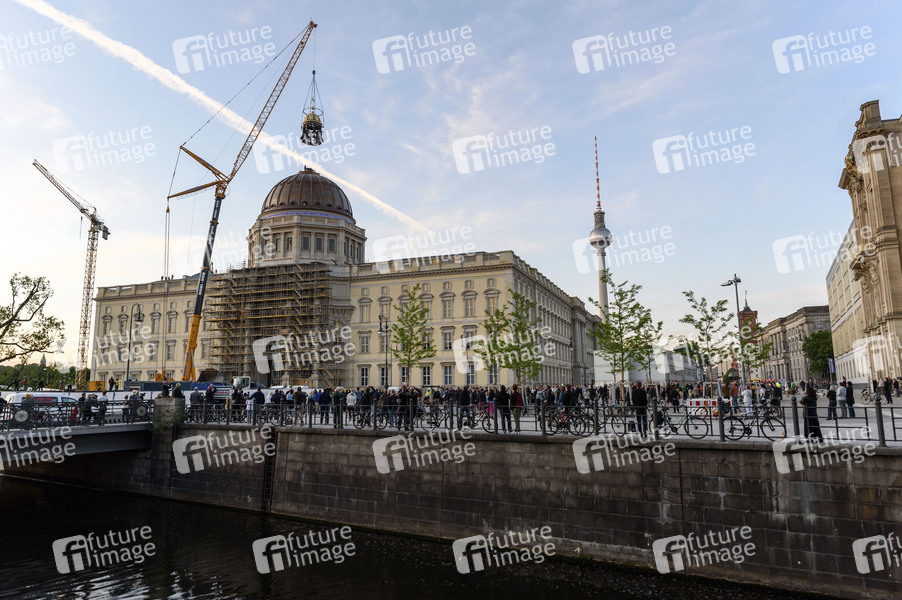Architektur, Attraktion, Aufsetzung, Baustelle, Bauwerke, Berliner Stadtschloss, Christentum, Fertigstellung, Geschichte, Inschrift, Kolonialismus, Kran, Kreuz, Kultur, Kunst, Kuppel, Kuppelkreuz, Kuppellaterne, Laterne, Monarchie, Montage, Museen, Museum, Rekonstruktion, Religion, Restitution, Schloss, Sehenswürdigkeiten, Sightseeing, Stadtschloss, Wiederaufbau