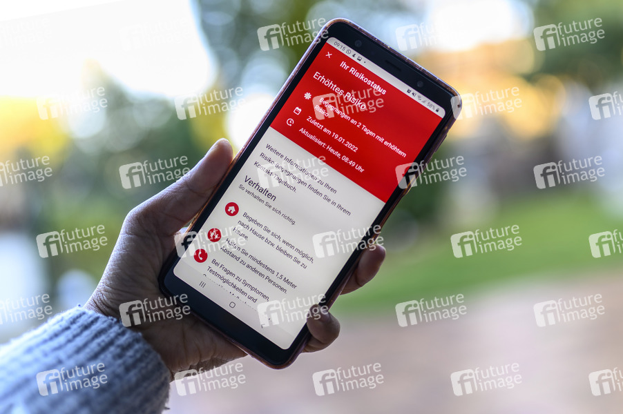 Die Corona-Warn-App zeigt auf einem Handy den Status 'erhöhtes Risiko' aufgrund möglicher Begegnungen mit positiven Kontaktpersonen an. (Themenbild, Symbolbild) Frechen, 24.01.2022