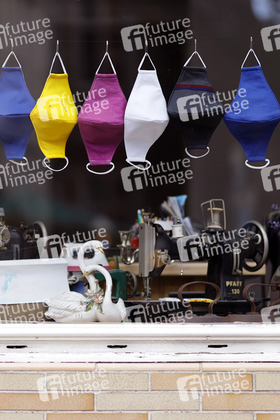 Verschiedene Masken aus Stoff hängen im Fenster einer Schneiderei. Bonn, 03.07.2020