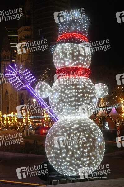 Leuchtinstallation Schneemann mit Klobürste am City-Weihnachtsmarkt an der Gedächtniskirche auf dem Breitscheidplatz. Berlin, 16.12.2024