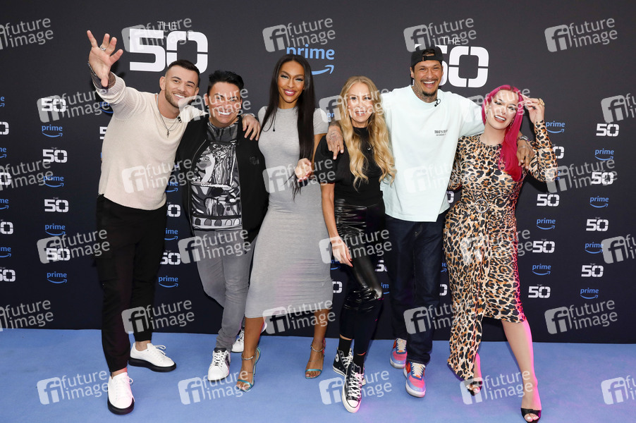 Serkan Yavuz, Matthias Mangiapane, Cecilia Asoro, Jenny Elvers, Yasin Mohamed und Raffa Plastic beim Photocall zur Amazon Prime Video Reality-Show 'The 50' in der Wolkenburg. Köln, 09.04.2024